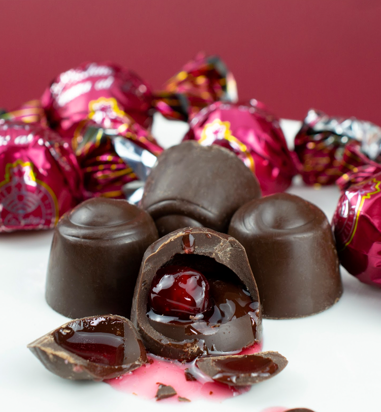 Estuche Cerezas al Licor 140 g Delicioso chocolate amargo en forma de bombón relleno de cereza al licor. Contenido Cajilla con 140 g.
