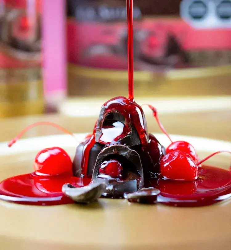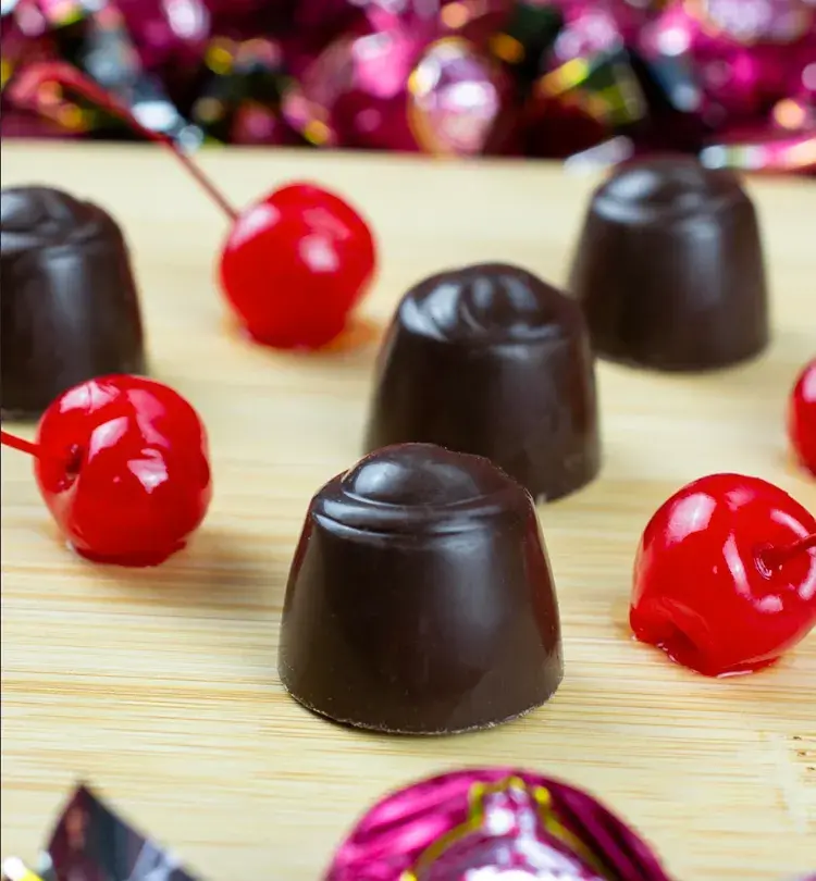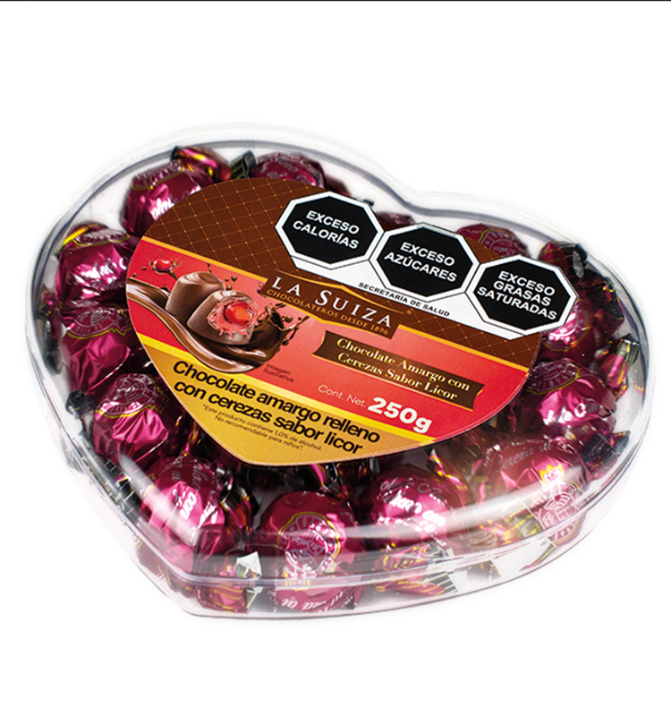 Corazón Cerezas al Licor 250 g Delicioso chocolate amargo en forma de bombón relleno de cereza al licor. Contenido Estuche con 250 g.